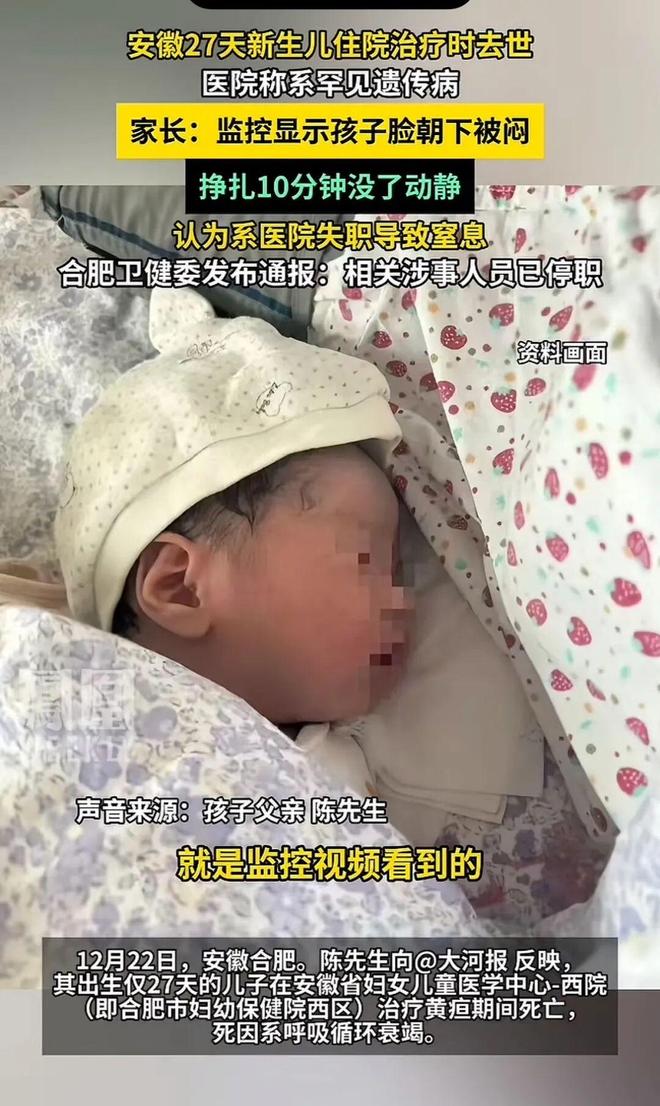 又一新生兒死亡!合肥,一新生兒黃疸住院治療,結(jié)果突然死亡。家長(zhǎng)查看監(jiān)控后發(fā)現(xiàn),孩子竟然臉朝下被悶在床上掙扎了10分鐘,半小時(shí)后才被發(fā)現(xiàn),醫(yī)院一開始還想推卸責(zé)任稱系遺傳病致危!網(wǎng)友:孩子是來(lái)治病的,結(jié)果在醫(yī)院丟了命,太讓人痛心了! 陳先生...